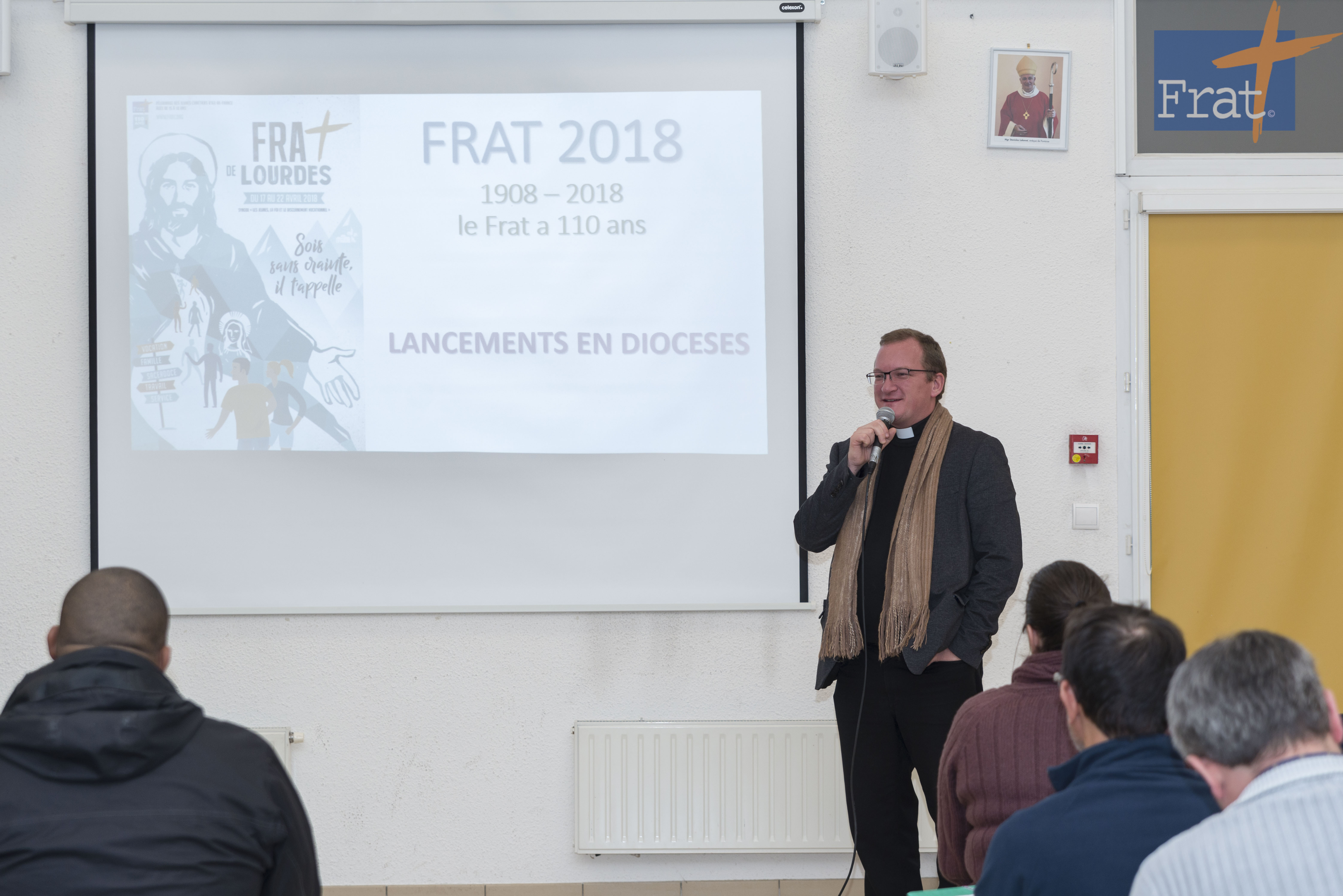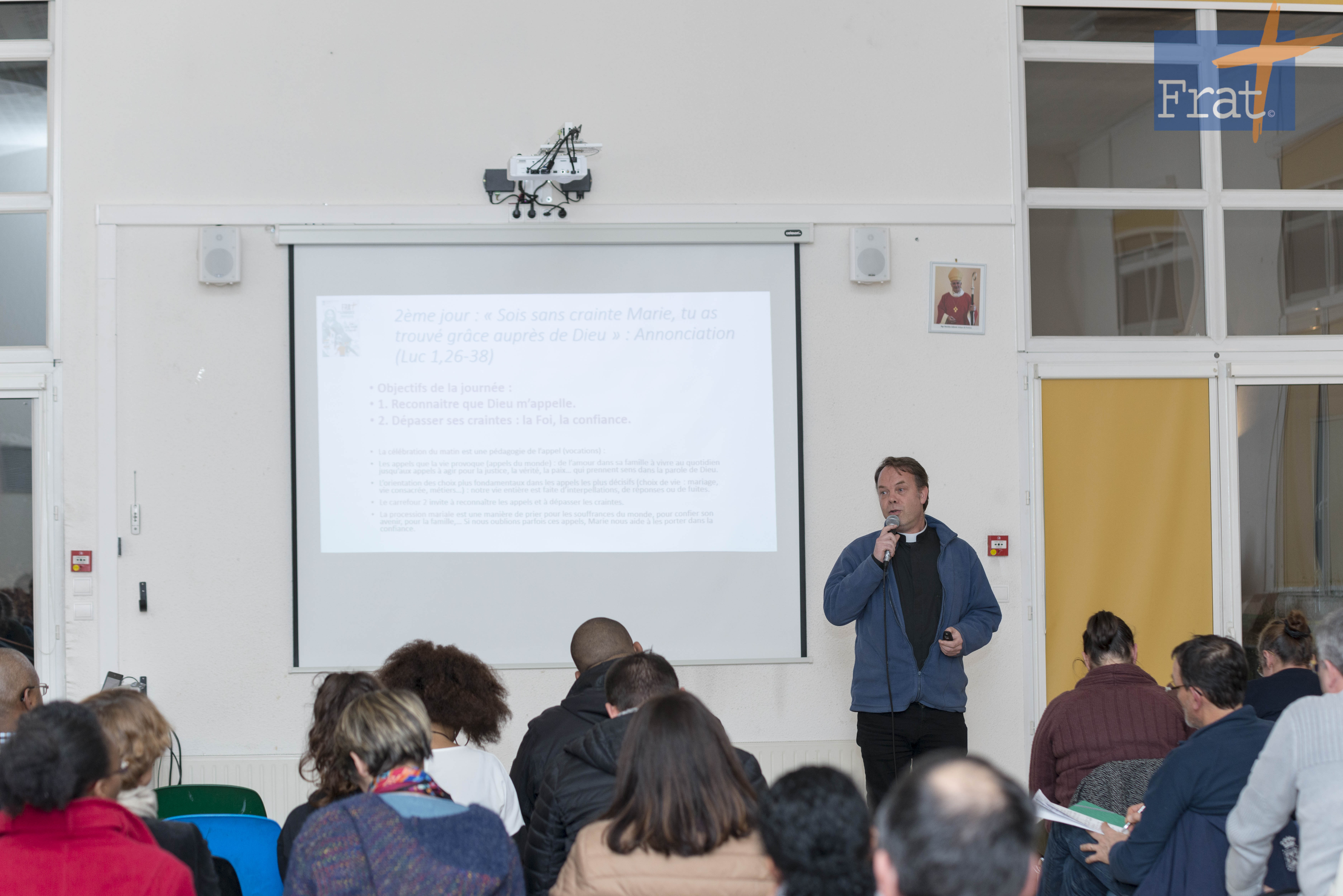 La phrase du thème du Frat est tiré de l’évangile de l’annonciation : «Sois sans crainte, Marie, car tu as trouvé grâce auprès de Dieu» (Lc 1, 30). Quand Dieu appelle, bien des peurs se manifestent. A chaque appel, Dieu invite toujours à dépasser les peurs. « Sois sans crainte » se retrouve en particulier pour David, Zacharie, Marie et Paul.